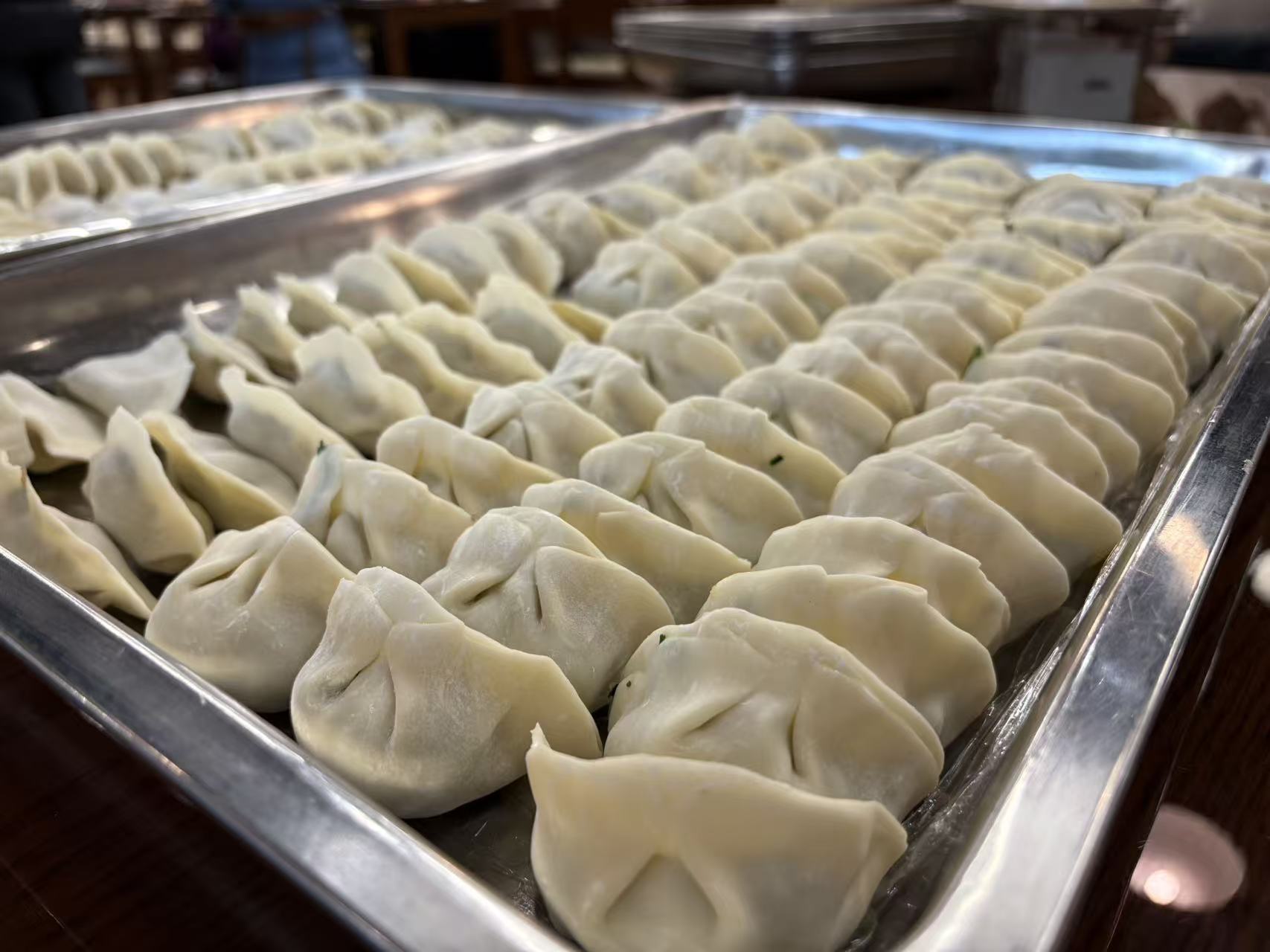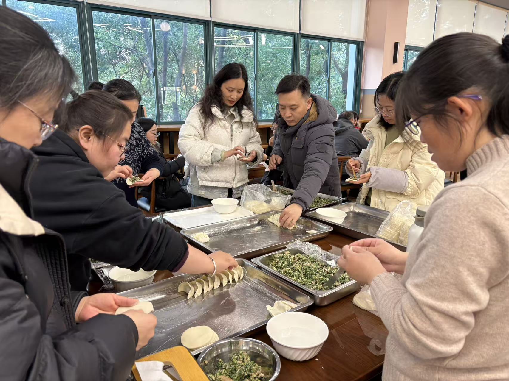 老师们踊跃参与,在安排好工作后陆续来到活动现场。大家洗净双手,迅速进入状态,或分皮、或包馅、或摆放,分工协作,默契配合。一时间,现场变成了热闹的“饺子工坊”。手法娴熟的员工动作流畅,包出的饺子形如元宝,精致美观;初学者则虚心请教,创意频出,包出的饺子形状各异,充满趣味。
