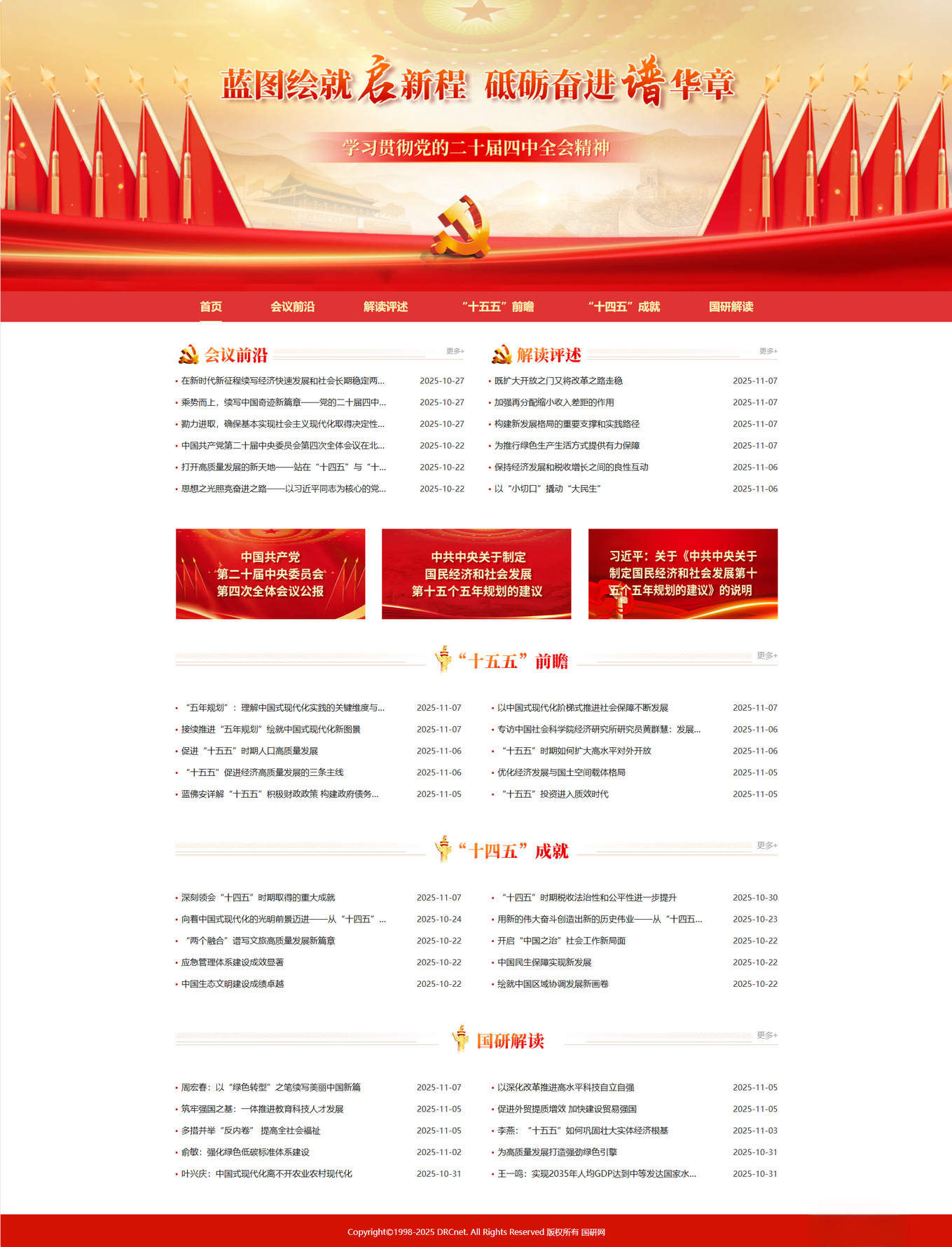 图书馆新上线“学习贯彻党的二十届四中全会精神”专题(国研网)(https://zhuanti.drcnet.com.cn/2025FourthPlenum)。专题精心设置 “会议前沿”“解读评述”“‘十五五’前瞻”“‘十四五’成就” 等栏目,全面收录二十届四中全会相关报道、重要文件,以及社会各界的深度解读评述与分析文章。此外,专题还特别设置了“国研解读” 栏目,集中收录国研中心专家针对全会精神的权威解读文章与核心观点,为学习领会二十届四中全会精神提供专业参考。