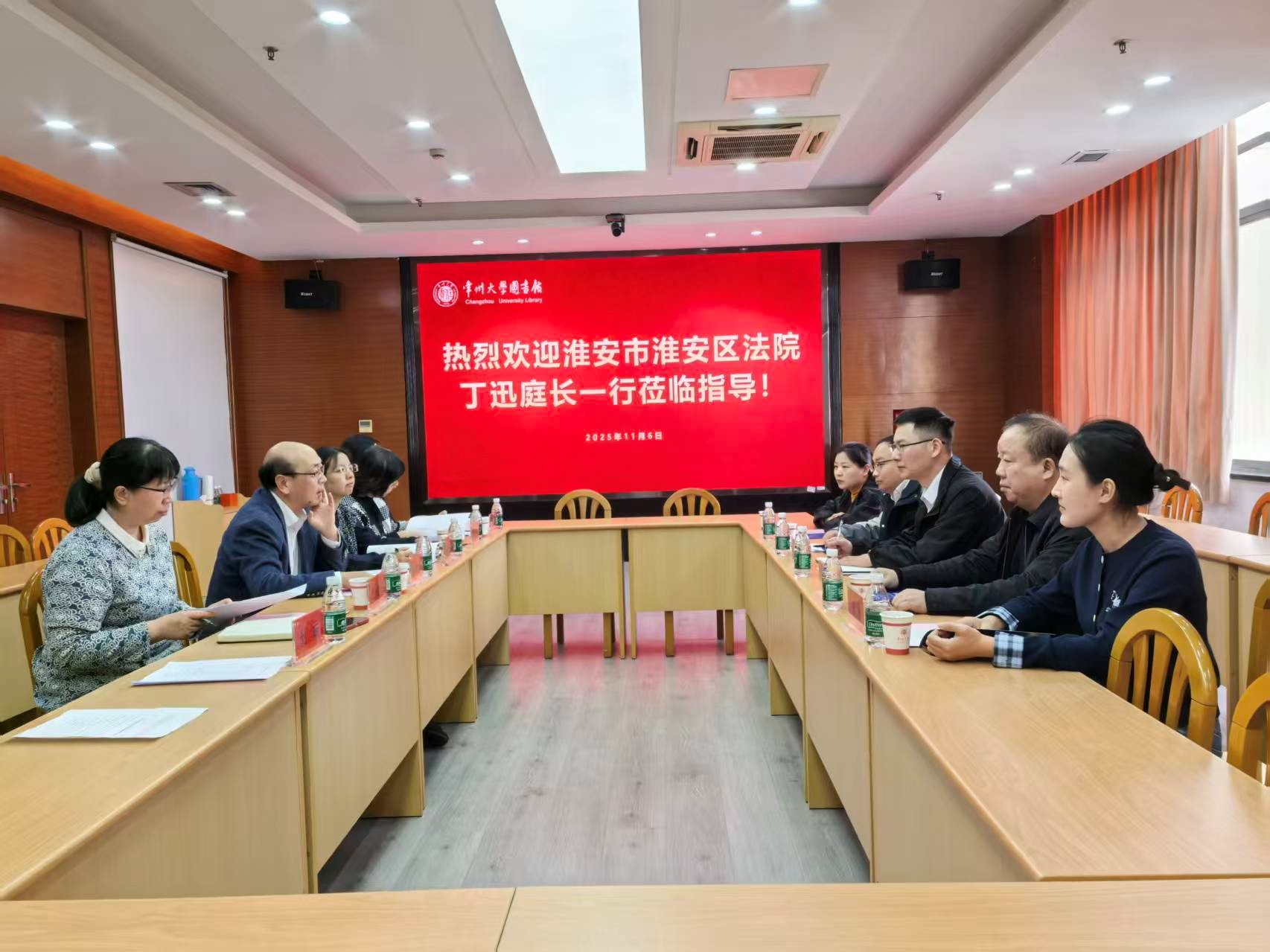 11月6日上午,淮安市淮安区人民法院丁迅庭长一行莅临我校图书馆访问交流,双方聚焦非物质文化遗产传承、知识产权保护等议题深度洽谈。图书馆党总支书记、馆长侯新兵主持会议,副馆长宗彩娥及相关部门负责人参会。